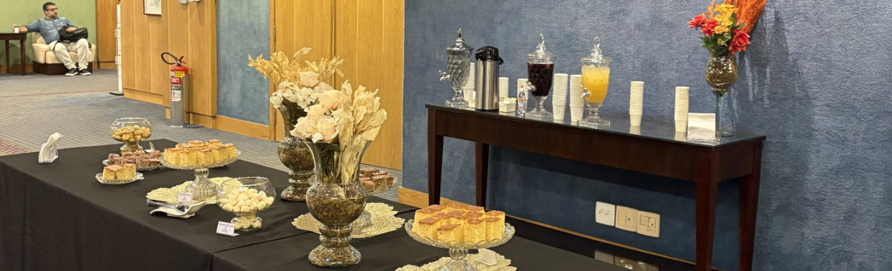 Perfeito para recepção de congressos, palestras e encontros profissionais. Bebidas quentes, pães, bolos e opções leves.